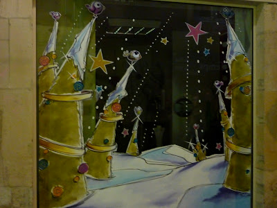 Très peu de vitrines peintes, je trouve pourtant que c'est une belle alternative pour décorer les devantures de commerces dont les produits n'ont rien de festifs. Par exemple, ici, je crois que cette photo a été prise devant chez un coiffeur.