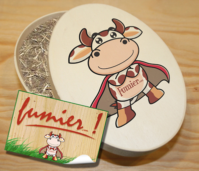 Mais attention, la bouse en question vient directement de Franche-Comté, est présentée dans une jolie boîte en bois, et pour 8,50€, en plus de l'amour et du savoir-faire de Roger, le Roi du Fumier, tu pourras même ajouter à votre envoi une petite carte personnalisée... Si c'est pas bien pensé, ça !!!
