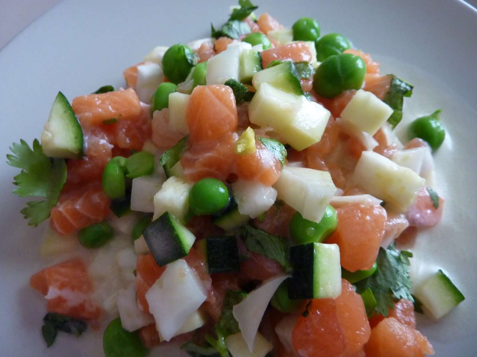 Théoriquement, le tartare devait être accompagné d'un espuma au jus de pamplemousse et à l'huile d'olive... Mais, quand tu t'aperçois en percutant la première des deux cartouches de gaz qu'il te reste que tu as oublié de mettre le joint du syphon, et quand tu sors en courant et accessoirement en bermuda pour aller en vitesse en acheter alors qu'on est le 1er mai et qu'aucun supermarché n'est ouvert le 1er mai, là, tu te dis que l'espuma, tu vas faire sans...! Remarque, sans, c'était délicieux aussi !!!