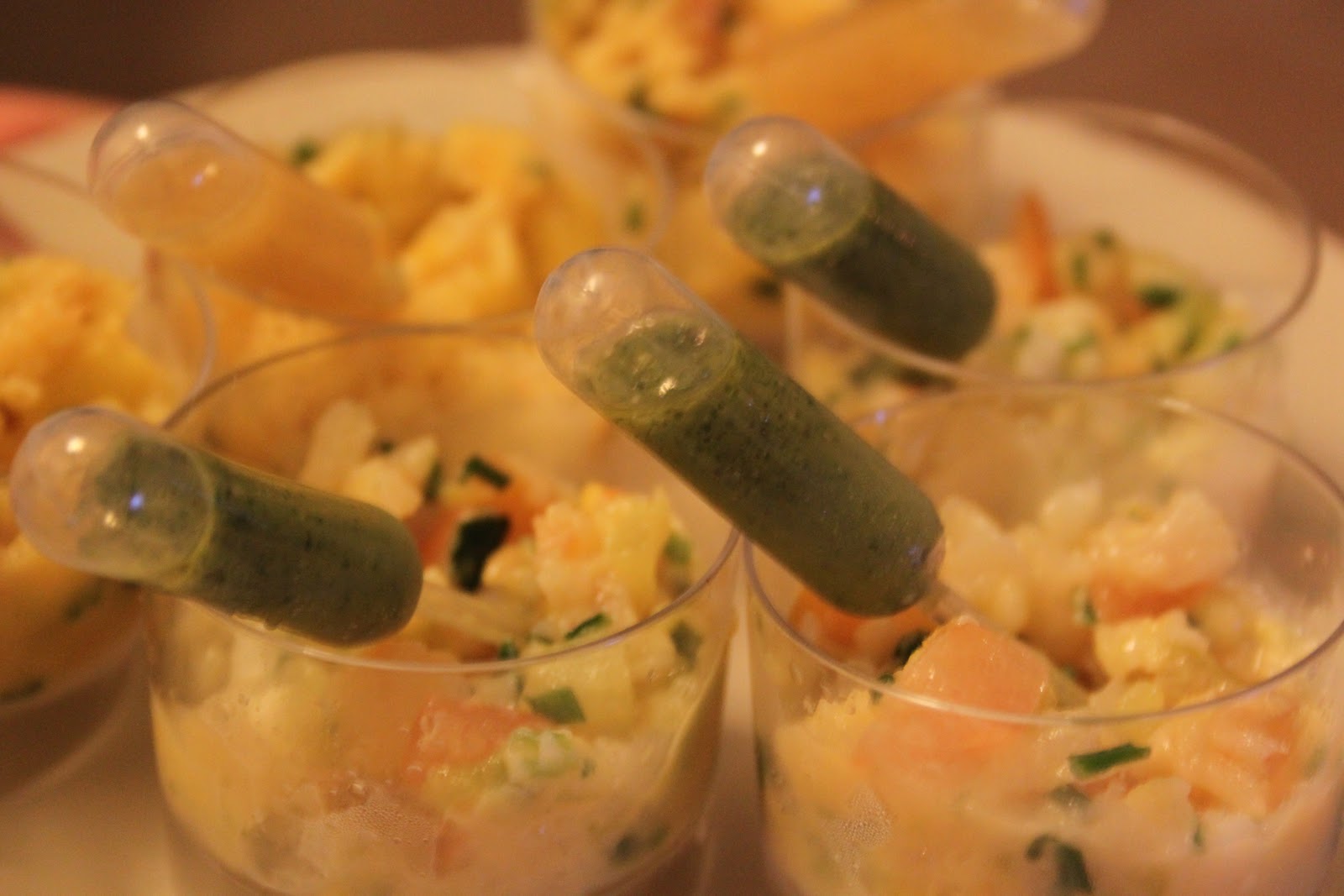 Des coupettes apéritives : tartare de Saint-Jacques - petits légumes - émulsion au basilic, émincé de crevettes - mangue - émulsion aux agrumes...