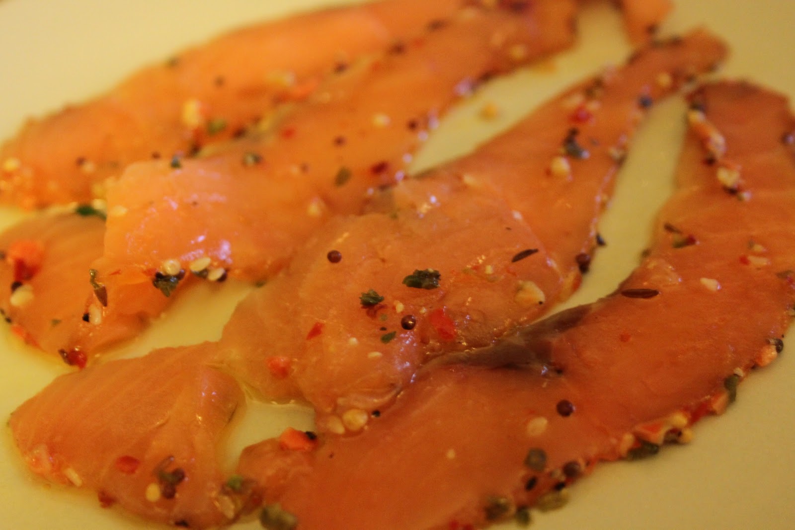 Un émincé de saumon mariné à l'huile d'olive et aux épices douces...