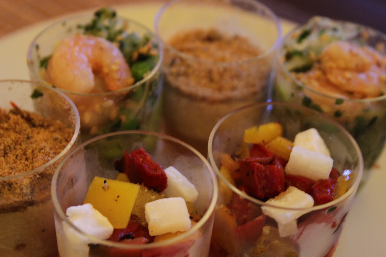 Des petites verrines : bloc de foie gras de canard - ananas - crumble pain d'épices, crevettes - légumes croquants - sauce soja, chorizo - duo de poivrons grillés - manchego...