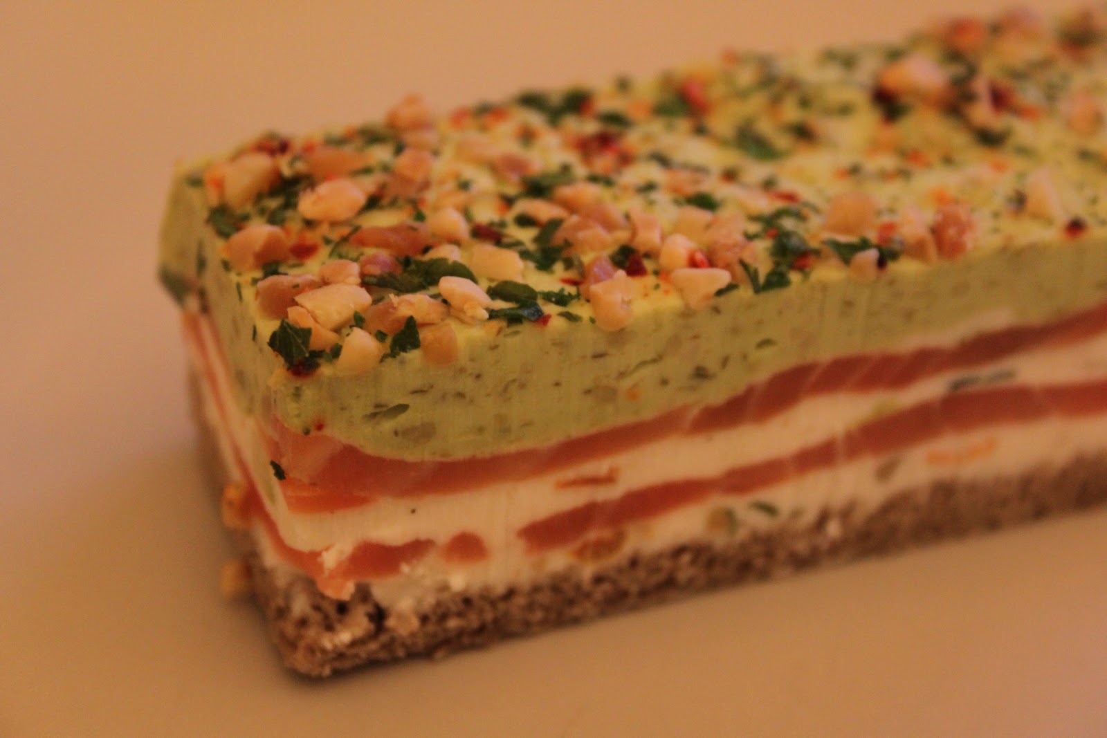 Des mille-feuille de saumon fumé, fromage frais, basilic et petits légumes...