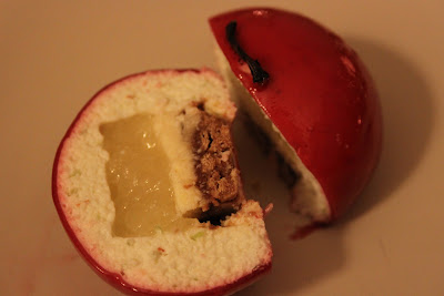 Et, pour finir, des croustillants façon pomme d'amour : mousse à la pomme verte, cœur à la pomme, crème façon cheesecake et biscuit au speculoos...