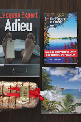 Le fameux Adieu de Jacques Expert qui se trouvait depuis sa sortie dans ma LàL, un polar régional afin que je découvre mieux la Picardie, un magnifique calendrier qui va m'emmener dans des îles paradisiaques tout au long de l'année, et une spécialité bien de chez elle aussi : des macarons d'Amiens.