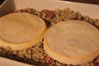 Bref, je me calme et je résume : des diots fumés cuits 20 minutes dans de l'eau bouillante et découpés en rondelles, des crozets cuits, on mélange bien le tout dans un plat à gratin, on met un reblochon coupé en deux au-dessus et hop, une vingtaine de minutes au four à 200°.