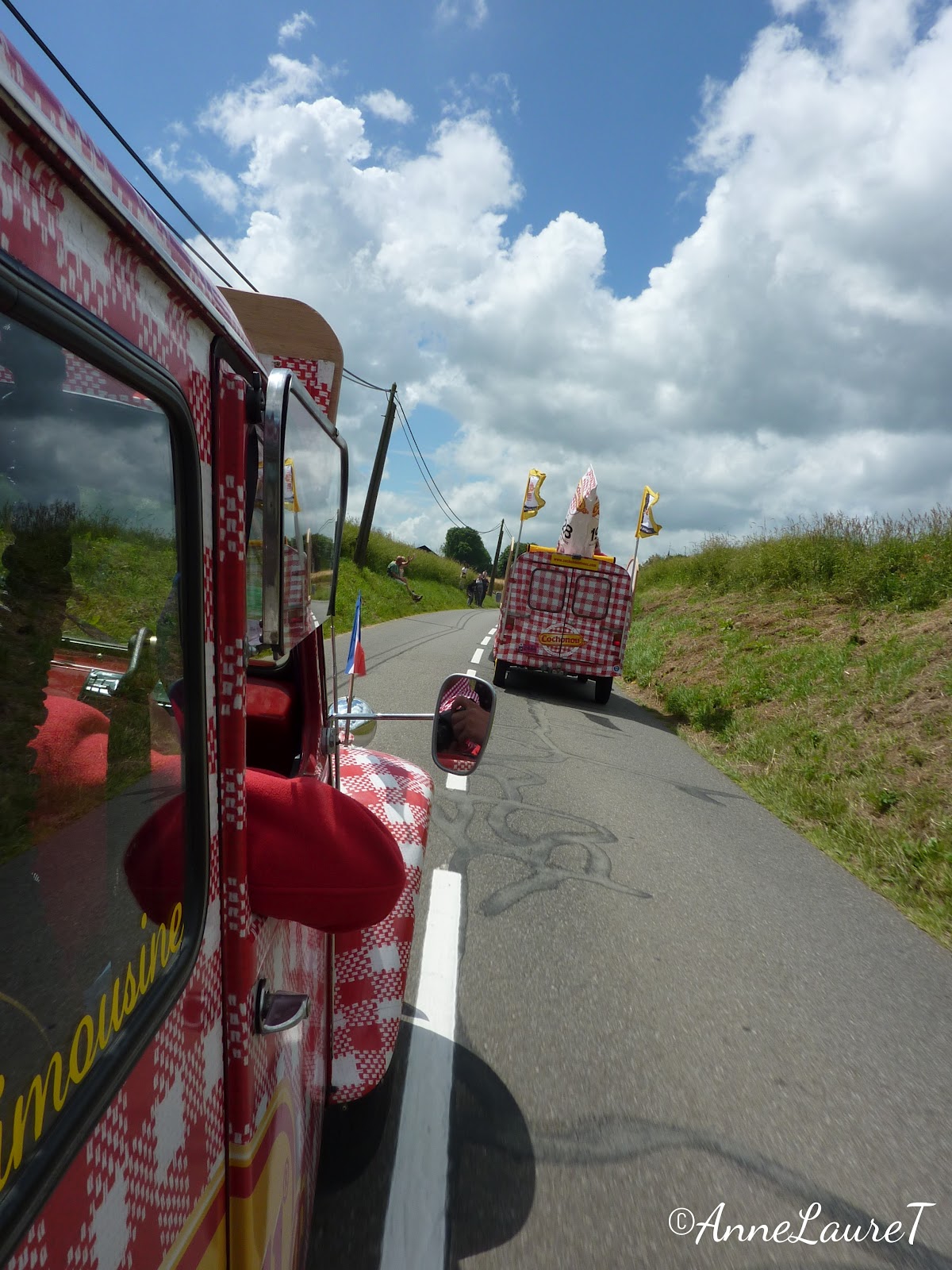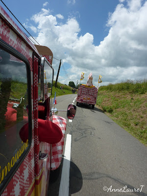 Sur la route du retour de mon chouette séjour gallois, après une semaine passée très loin de toute technologie, il m'est venu la bonne idée de me connecter à ma boîte-mail alors que je sirotais un café infect dans le terminal Eurotunnel en attendant mon heure. Bien m'en a pris parce que, dans ladite boîte, il y avait un message bien sympa, quoi que quelque peu saugrenu, c'est pas moi qui le dis, c'est son auteur : Thibault, blogueur de son état, aux commandes pour la septième année de Cochonou et Vous, le blog à l'imprimé vichy rouge et blanc qui te fait vivre les coulisses du Tour de France et de sa caravane, me proposait de venir passer une journée avec lui sur le Tour justement... Enfin, ça, c'est la version light parce que, tu vas voir, ça a été une journée d'enfer, je vais essayer de ne rien oublier !!!