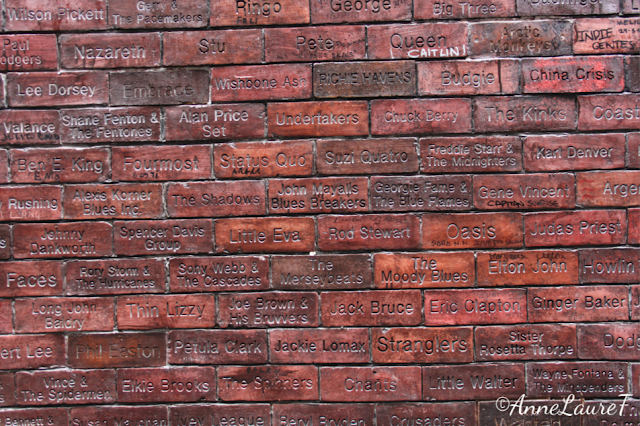 Juste le temps de jeter un œil au Cavern Wall of Fame, un projet initié à la fin des années 90 : ce mur a été construit à partir des briques de la fameuse cave détruite en 1974, chacune étant marquée du nom d'un des groupes ou musicien s'y étant produit entre 1957 et 1973, mais aussi de quelques uns y ayant joué bien plus récemment, comme Oasis ou les Arctic Monkeys... Encore une photo prise de travers, je sais, mais c'était celle sur laquelle on pouvait lire le plus de noms très chers à mon cœur de vieille rockeuse...!