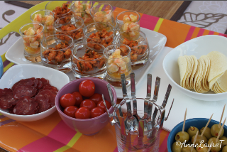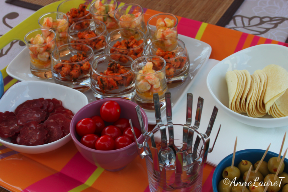 Un apéritif copieux, gourmand mais somme toute raisonnable : des verrines de crevettes faites maison, du saucisson de jambon, des olives et des tomates-cerises, quelques chips pour les enfants...