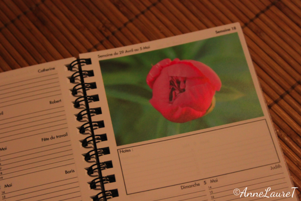 C'est un vrai agenda, de petit format, que tu pourras donc aisément glisser dans une de tes poches, avec des pages sur lesquelles sont inscrites les dates et tout et tout, une couverture en plastique rigide et transparent, et, pour chaque semaine, une photo de fleur je me répète prise par moi-même ce qui déjà en soi peut dans mes rêves les plus fous donner une certaine valeur à l'objet.
