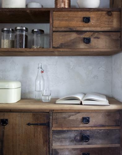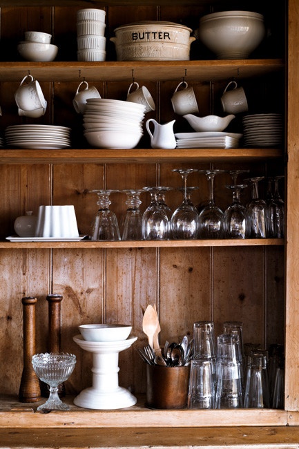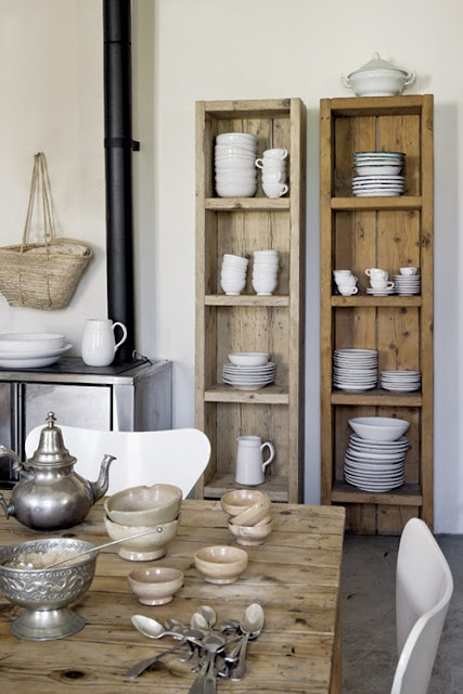 Je rêve de bois brut voire vieilli, de vaisselle blanche, de placards montant jusqu'au plafond, de meubles de récup' qui ont vécu, de jolis paniers, de plantes vertes un peu partout, d'une échelle accrochée en l'air pour y suspendre mes casseroles, mes faitouts... Bref, je rêve que ma cuisine soit aux antipodes de ce qu'elle est réellement. Et du coup, je retourne à mes rangements...!
