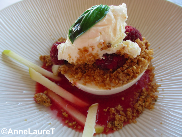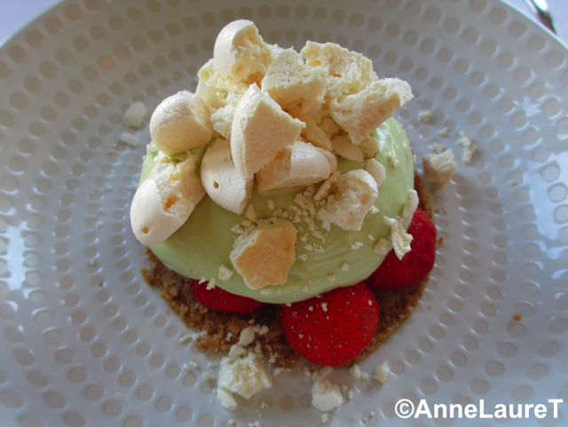 Les desserts sont vraiment à la hauteur du plat : un blanc-manger framboise-basilic pour moi, et une tarte fine aux fraises et sa crème de pistache pour mon Petit C., qui m'a très gentiment laissé goûter, je l'en remercie.