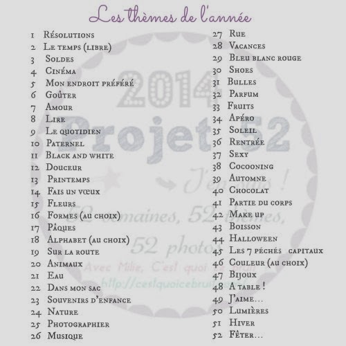 Oui, je sais, je suis une folle furieuse... Après toutes ces années d'échec sur divers Projets 365, même si 2013 a assurément été la moins pire de mes tentatives, j'ai replongé, je t'en ai parlé ce matin. Et comme si ça ne suffisait pas, le Projet 52 de Milie m'a fait de l'œil lui aussi. Bien sûr, je ne me fais aucune illusion : je risque fort d'exploser en vol, je m'en excuse par avance...! Mais ne partons pas défaitiste, sinon on ne fait plus rien.