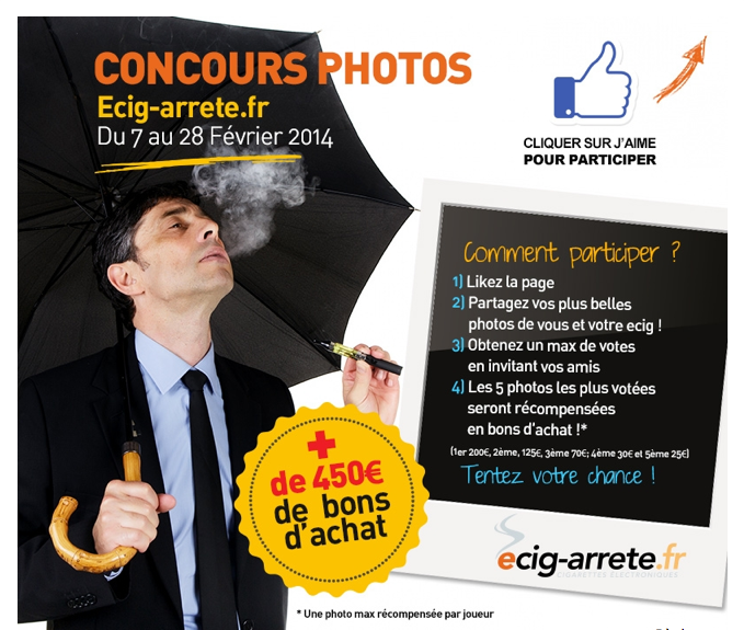 Pour le coup, histoire de joindre l'utile à l'agréable, et jusqu'au 28 février, si tu as choisi de t'aider d'une cigarette électronique, tu peux même participer à un chouette concours : tu t'inscris là, tu partages une photo de toi en train de vapoter, tu invites tes amis à voter et tu feras peut-être partie des cinq heureux gagnants qui se verront attribué un bon d'achat de 25, 30, 70, 125 et même 200€. Largement de quoi te permettre de mettre le tabac derrière toi pour de bon !