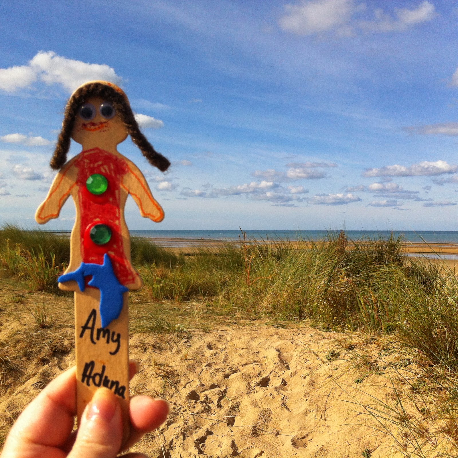Petite-Amy, c'est aussi ainsi que nous avons surnommé la poupée arrivée dans notre boîte aux lettres la semaine dernière. Elle nous a accompagnés tout au long de notre journée de balade avant-hier, à Caen le matin et sur une des plages du Débarquement l'après-midi. Sous un soleil de rêve, dans la foule des grands jours. Un dimanche parfait.