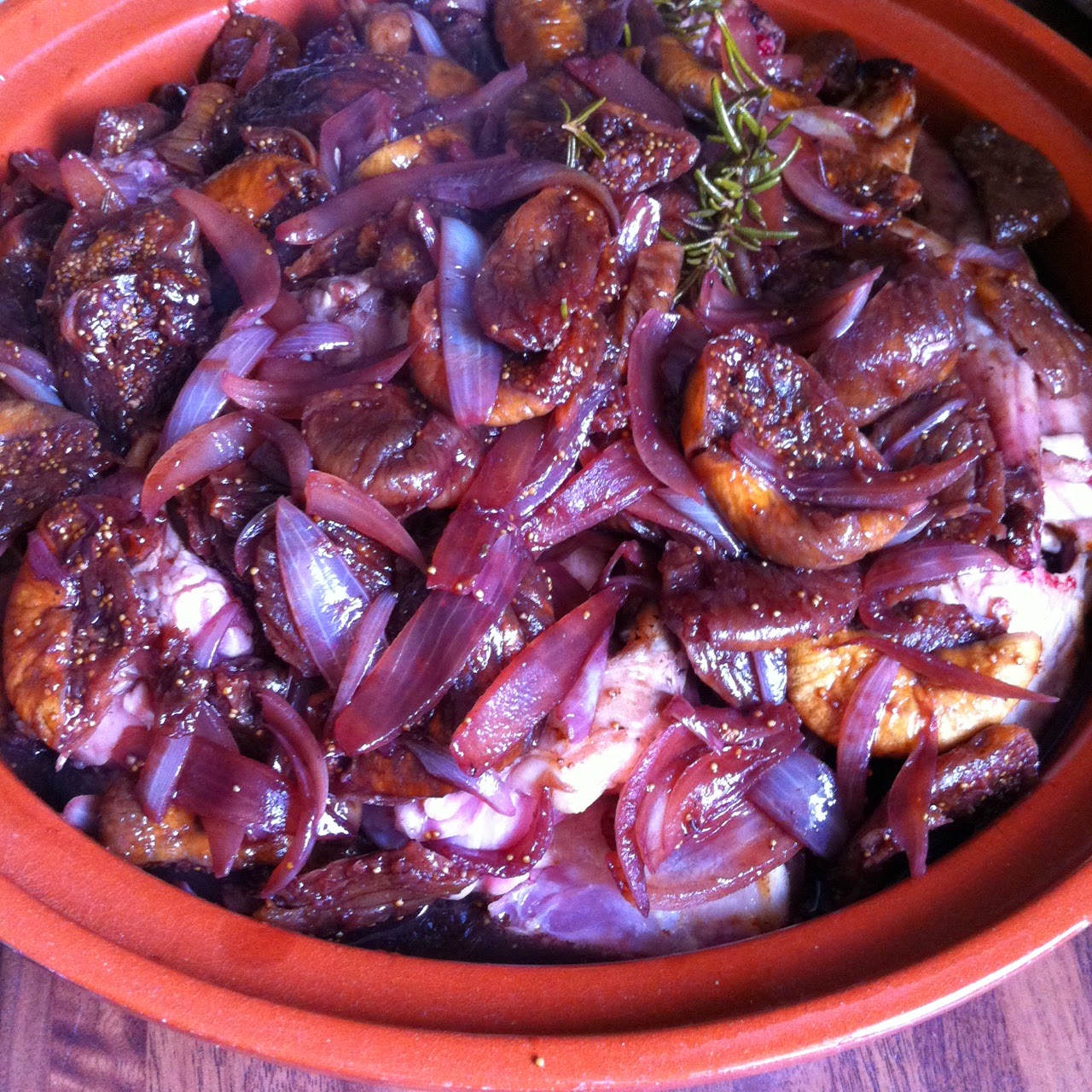 Une fois le lapin bien doré, tu ajoutes le vin, le vinaigre, l'eau, le fond de veau et le romarin. Puis les figues. Tu sales, peu, le fond de veau étant déjà bien salé, et tu poivres selon ton goût.