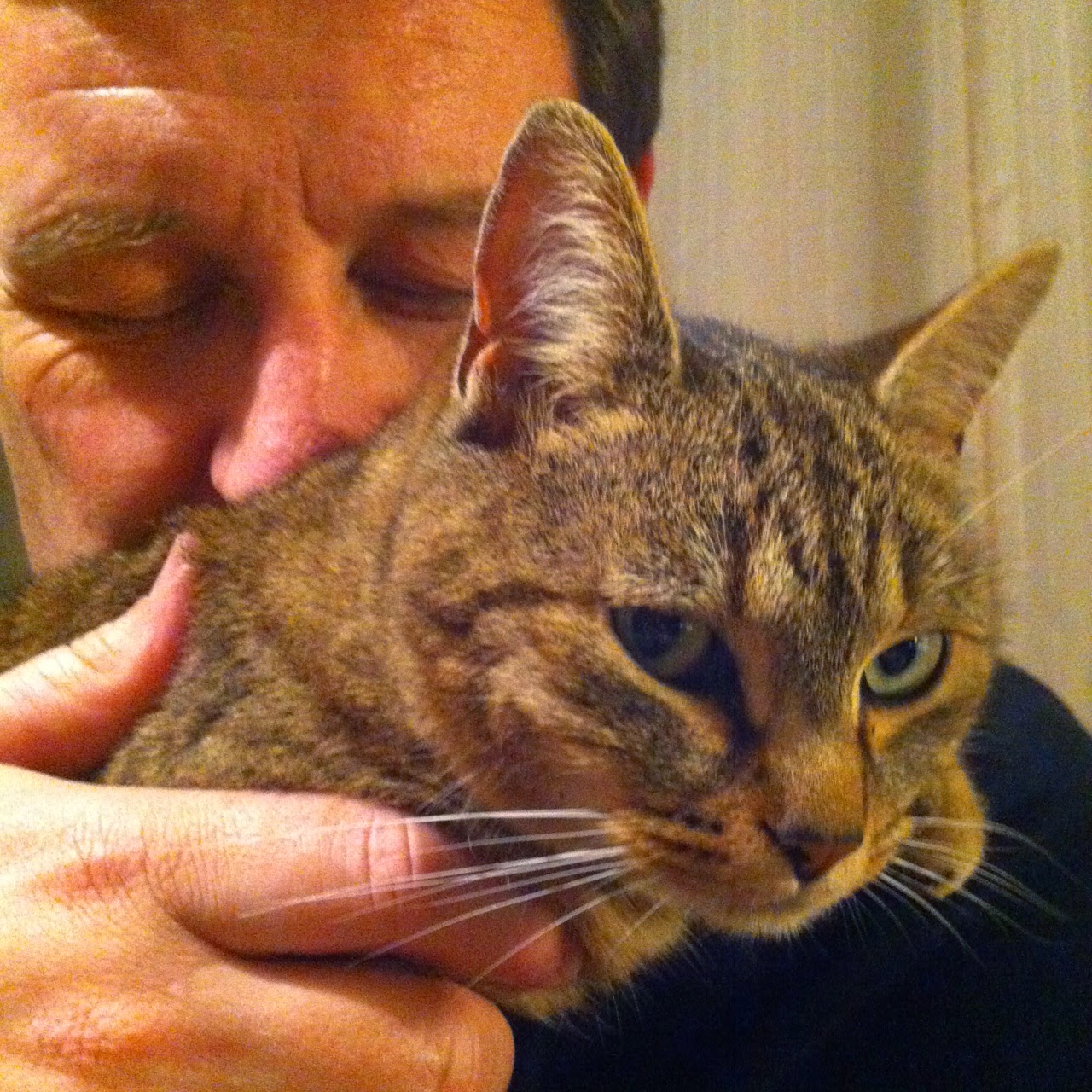 Ça y est, notre calvaire prend fin : Petit C. rentre enfin de son ibérique séminaire en bord de mer. Et là, c'est la foire d'empoigne pour savoir laquelle de nous toutes lui fera la plus belle fête, le plus gros câlin... Comme tu peux le constater sur la photo, c'est Couscous qui a gagné ! Et, vu l'œil noir qu'elle me jette, je n'ai pas vraiment intérêt à m'en mêler.