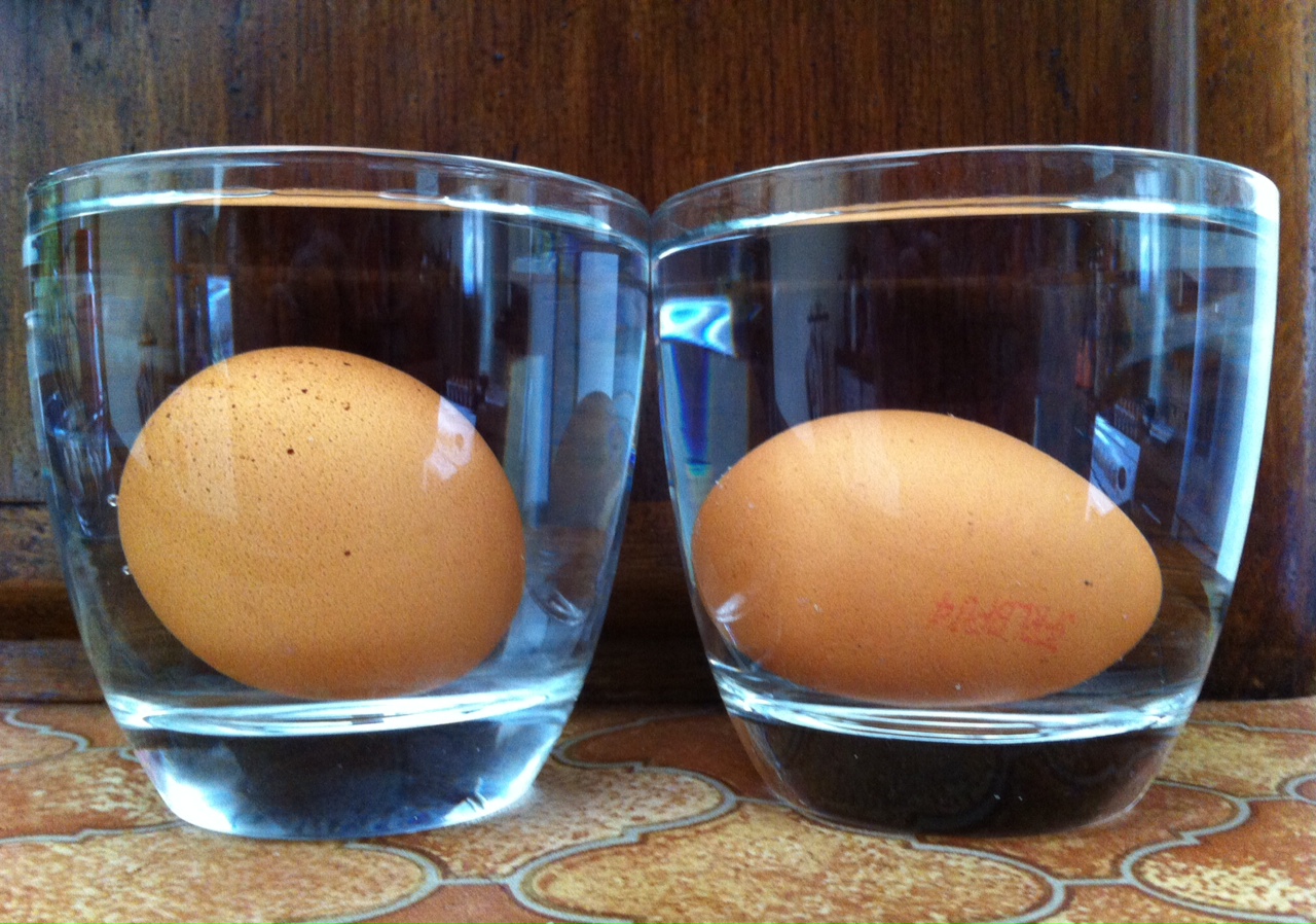 Fort heureusement, si l'œuf était marqué 3, il n'en a pas moins réussi le test de la fraîcheur. Plongé dans un verre d'eau bien froide, il a coulé directement au fond, contrairement à un autre qu'il me restait de ma dernière tournée à la ferme, pondu le 22 juillet. Pour info, plus il coule, plus il est frais, et par conséquent, plus il flotte, moins il l'est.