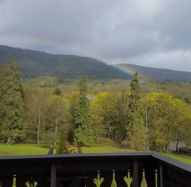 Le lendemain matin, après une nuit réparatrice, nous avons profité du génialissime buffet du petit-déjeuner. Avec le recul, je regrette de ne pas m'être laissée tenter par une coupette de Crémant, après tout, j'aurais bien pu/dû, MariChéri n'a pas résisté au munster, lui ! Nous nous sommes offert un dernier kiff' avant de reprendre la route direction la Suisse, une séance de jacuzzi en plein air, sous un léger crachin, avec vue sur un arc-en-ciel qui est resté accroché à la colline pendant près d'une heure : magique. Tout comme cette jolie parenthèse hors du temps que nous venions de vivre.