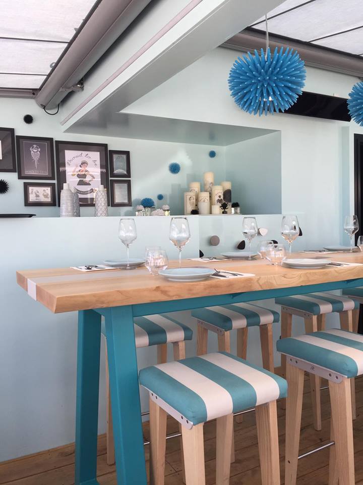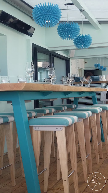 Une décoration charmante toute de bois clair et de dégradés allant du blanc au bleu canard de mer, une jolie vaisselle assortie. Des banquettes et des mange-debout. De très larges ouvertures permettant de profiter du ciel, de la plage toussa toussa... Bref, tout pour me plaire.
