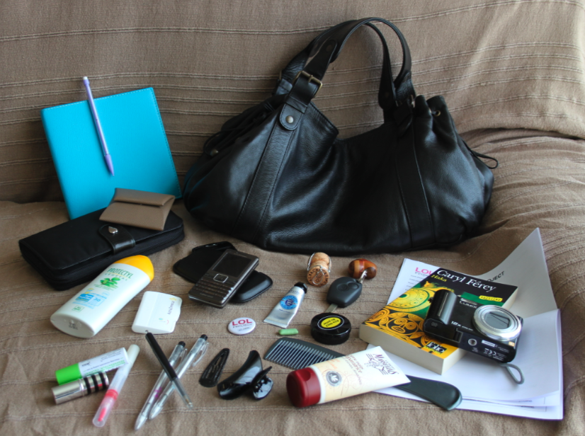 Un agenda, un compagnon de voyage, un porte-monnaie Hermès qui vaut plus cher que tout le reste réuni (le cadeau de ma sœurette pour mes 40 ans), un tube de crème solaire, un critérium, trois stylos-bille noirs, un comprimé de la dernière chance contre le mal de tête, un rouge-à-lèvres, un gloss, un baume pour les lèvres (rien que ça...!), les clés de Miss KK, le dernier roman en cours de lecture, les contrats que nous avons signés ce matin, Petit C. et moi, avant de participer au LOL Project, mon badge du LOL Project, le bouchon de la bouteille ouverte à l'occasion de l'anniversaire de mon beau-père dimanche dernier, mon fidèle Mister Lulu, un peigne, une barrette, une pince à cheveux, deux téléphones même si je n'ai qu'une seule ligne (y'en a un qui prend de supers photos, alors que l'autre est parfait pour surfer sur le net), un vieux chewing-gum, ma petite boîte de pastilles mentholées siglée "Prix SNCF du Polar", deux tubes de crème pour les mains...