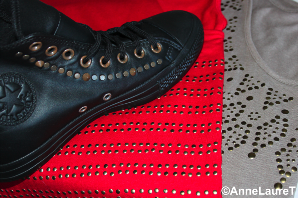 Et puis, et surtout même devrais-je dire, il y a eu les Converse. Aperçues en coup de vent chez Nikit@, elles m'ont obsédée jusqu'à ce que je cède à leur appel : il me les fallait absolument ! Entre la qualité du cuir et la couleur des clous, toutes deux parfaitement assorties à mon sac à main préféré, elles ont tout pour que je me félicite chaque jour de cet investissement achat.
