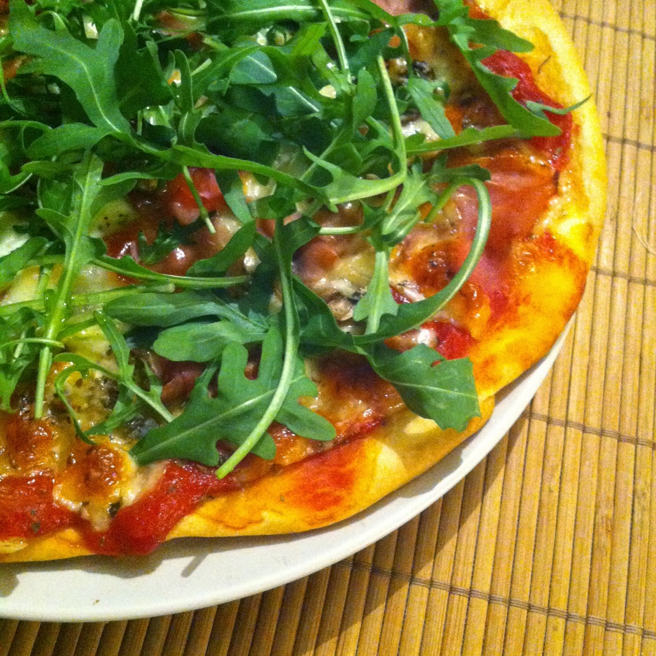 ... savouré une pizza maison. Le meilleur moyen d'avoir exactement tout ce que l'on veut dessus, et sans payer de supplément...! C'était donc tomate, mozzarella, champignons, chèvre, jambon italien, et roquette arrosée d'un filet d'huile d'olive, tout ce que j'aime.
