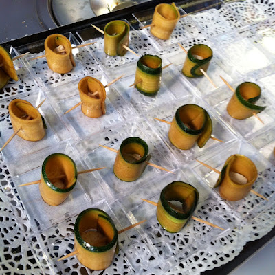 Rouler les lamelles de courgette pour former de petits tubes, les maintenir en forme en les transperçant à l'aide d'un cure-dent en bois.