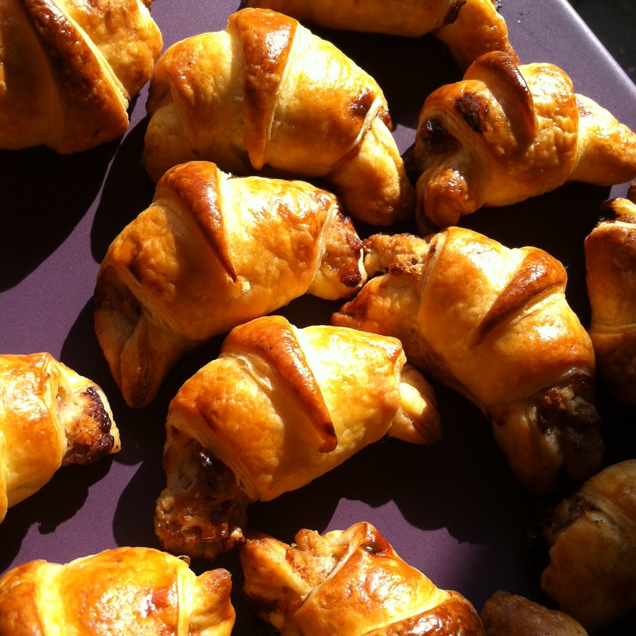 Quand nous fêtons un anniversaire, ici, la tradition veut que la personne concernée choisisse son menu. Et pour ses vingt ans, Mademoiselle A. n'a pas fait les choses à moitié : elle ne voulait pas particulièrement d'un repas entier, mais un genre d'apéritif déjeunatoire. Elle a donc dressé une très exhaustive liste de ce qui lui ferait plaisir. Bien évidemment, ça nous a permis, à son père et à moi, de nous occuper longuement en cuisine, l'une des choses que nous préférons partager par-dessus tout. Mais pour le coup, nous étions tellement occupés à mettre les petits plats dans les grands que je n'ai pour ainsi dire pris aucune photo de tout ce que nous avons préparé. Excepté, in extremis, de ces divins petits croissants.