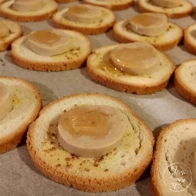 Les nature m'ont servi à préparer des canapés à base de moutarde, d'une rondelle de boudin blanc et d'une goutte de miel, celui de la photo pourrie prise à la lumière pourrie de ma cuisine by night. Passés un peu au four, c'était un délice.